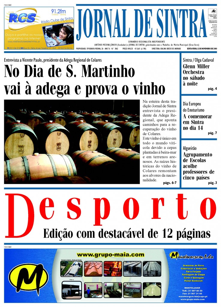 A edição número 3.862 do Jornal de Sintra já está impressa e seguiu esta 5.ª feira, dia 11, via CTT para os assinantes espalhados por todo o concelho, e um pouco por todo o país e estrangeiro. O destaque e manchete de capa vai a Adega Regional de Colares e a entrevista ao seu presidente Vicente Paulo, a propósito do vinho ramisco e da comemoração do dia de S. Martinho.