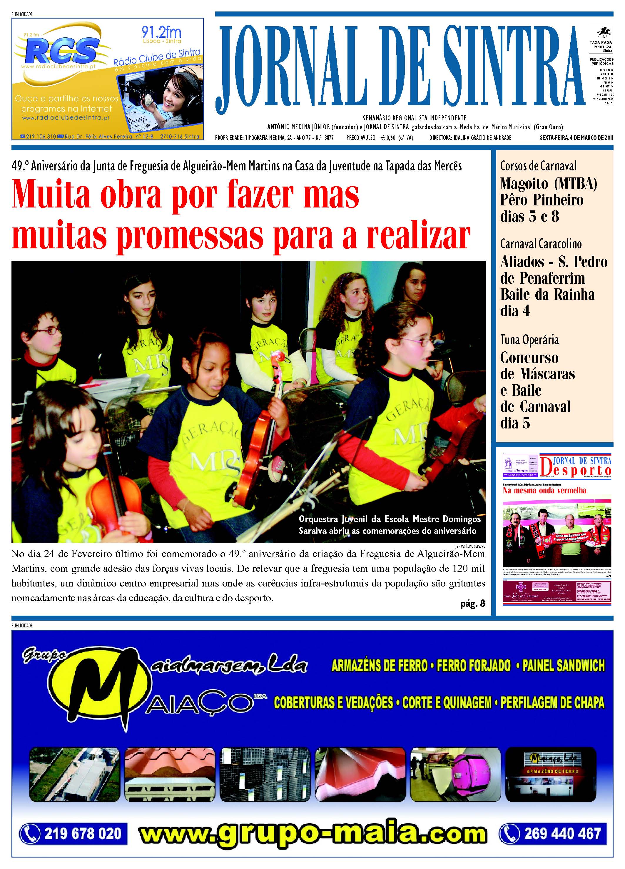 Já está em distribuição via CTT para assinantes, a edição n.º 3.877 do Jornal de Sintra que esta semana dedica a capa ao 49.º aniversário da freguesia de Algueirão- Mem Martins, cerimónia realizada na Casa da Juventude da Tapada das Mercês.