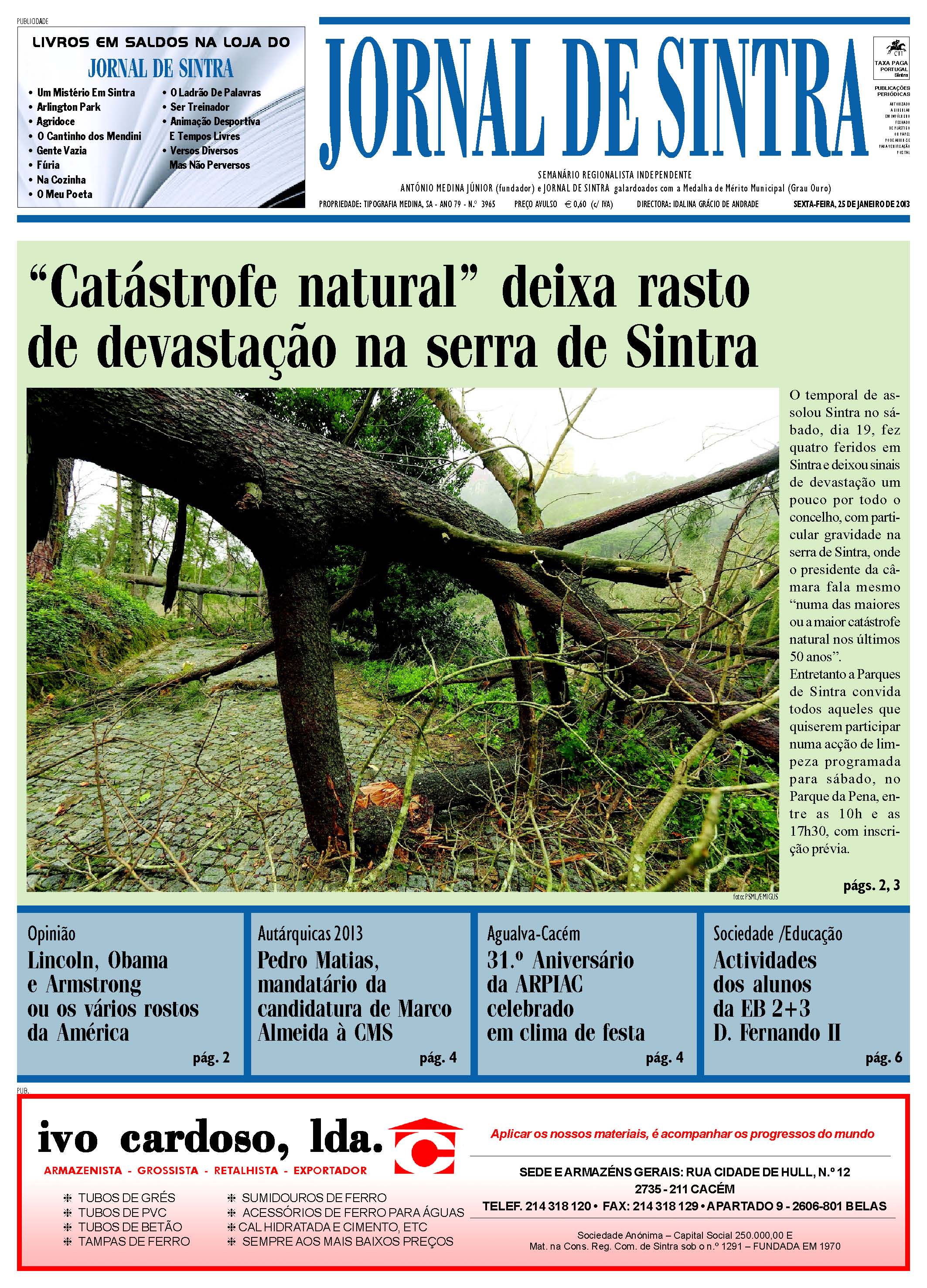 “Catástrofe natural” deixa rasto de devastação na serra de Sintra, é a manchete do Jornal de Sintra da edição n.º 3965 de 25 de Janeiro de 2013, nas pág. 2 e 3. Destaques para o artigo de opinião: Lincoln, Obama e Armstrong ou os vários rostos da América, pág 2; Autárquicas 2013 – Pedro Matias, mandatário da candidatura de Marco Almeida à CMS; Agualva-Cacém – 31.º Aniversário da ARPIAC celebrado em clima de festa; Educação – Actividades dos alunos da EBV 2-3 D. Fernando II.