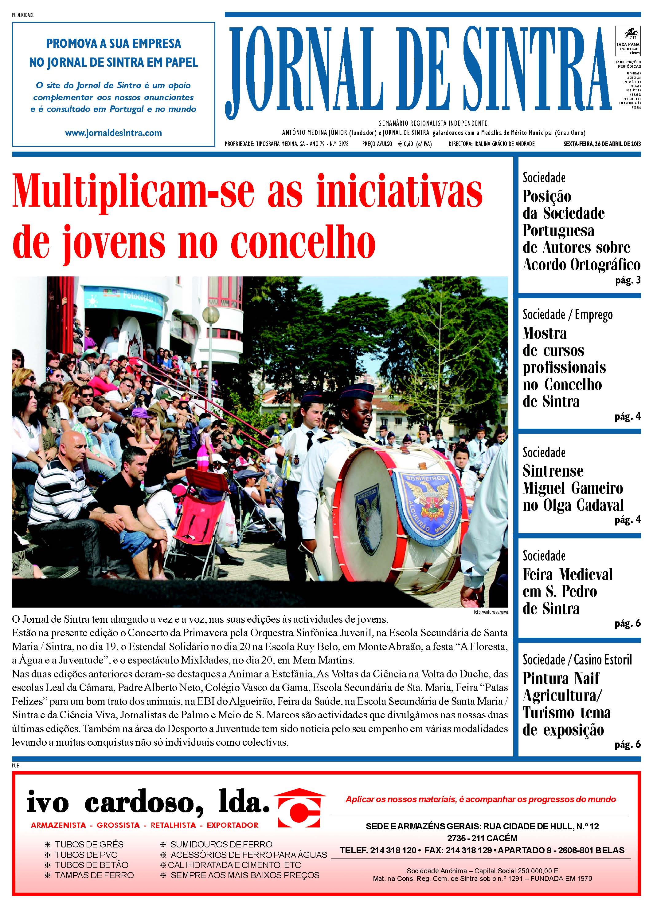 “Multiplicam-se as iniciativas de jovens no concelho” é a manchete do Jornal de Sintra, da edição n.º 3978 de 26 de Abril de 2013.