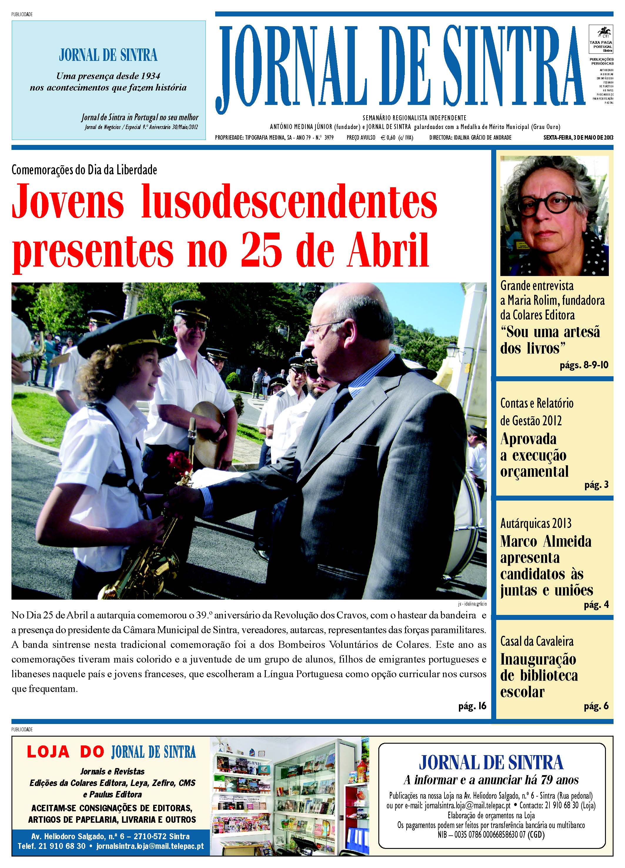Comemorações do Dia da Liberdade – Jovens lusodescendentes presentes no 25 de Abril é a manchete do Jornal de Sintra, edição n.º 3979 de 3 de Maio de 2013.