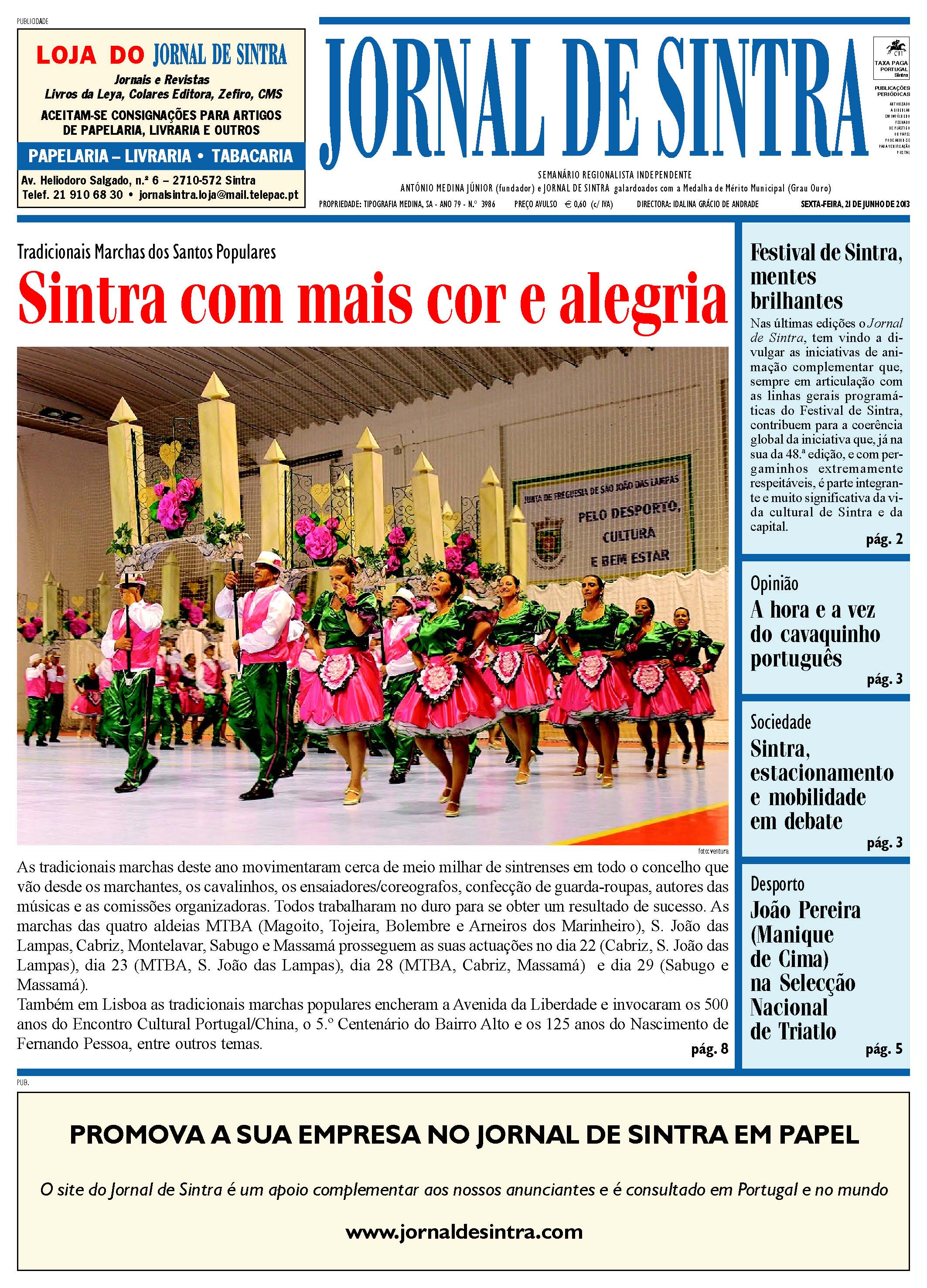 Tradicionais Marchas dos Santos Populares – Sintra com mais cor e alegria é a manchete do Jornal de Sintra, edição n.º 3986 de 21 de Junho de 2013.