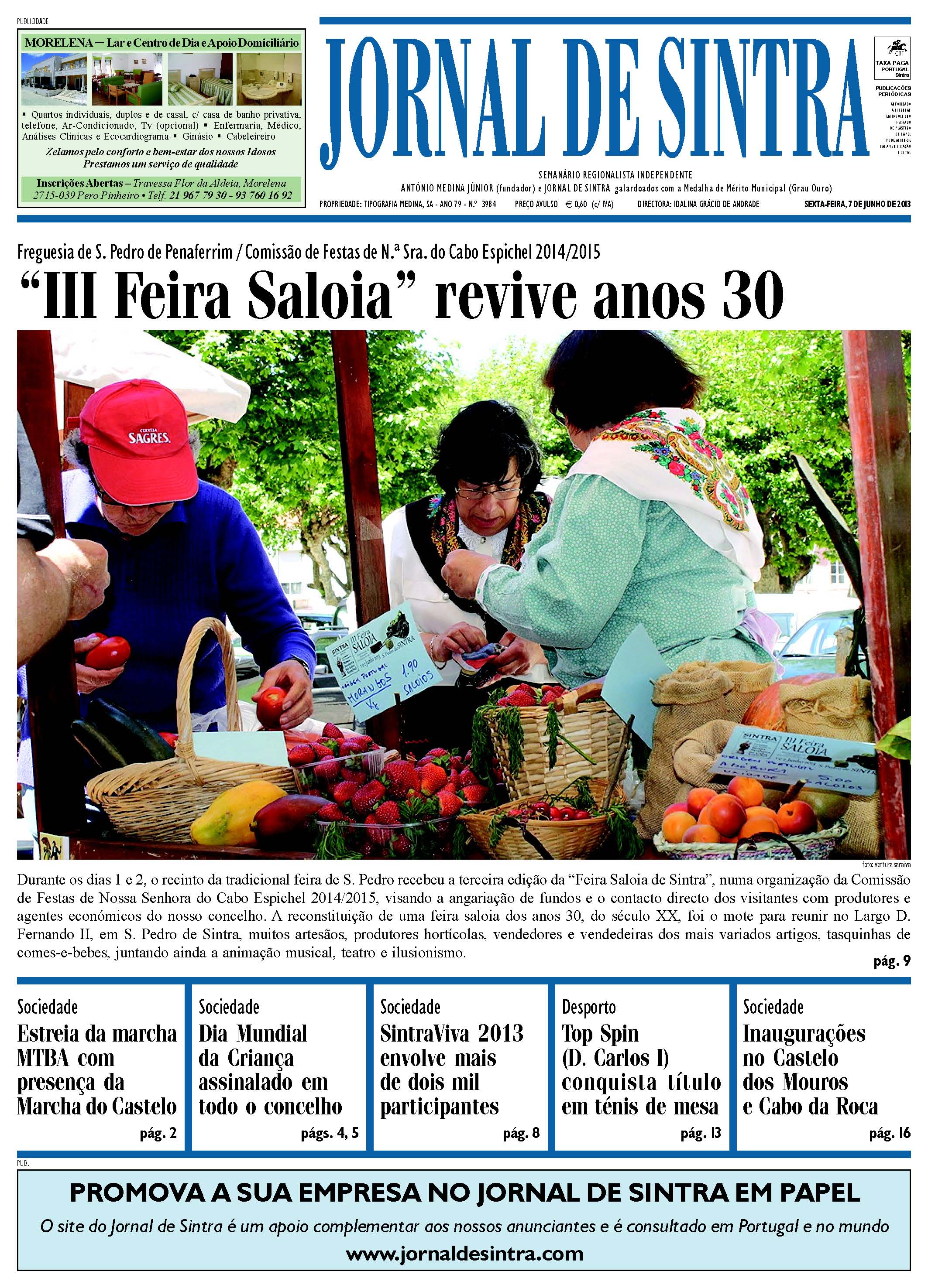 Freguesia de S. Pedro de Penaferrim / Comissão de Festas de N.ª Sra. do Cabo Espichel 2014/2015 – “III Feira Saloia” revive anos 30 é a manchete do Jornal de Sintra, edição n.º 3984 de 7 de Junho de 2013.