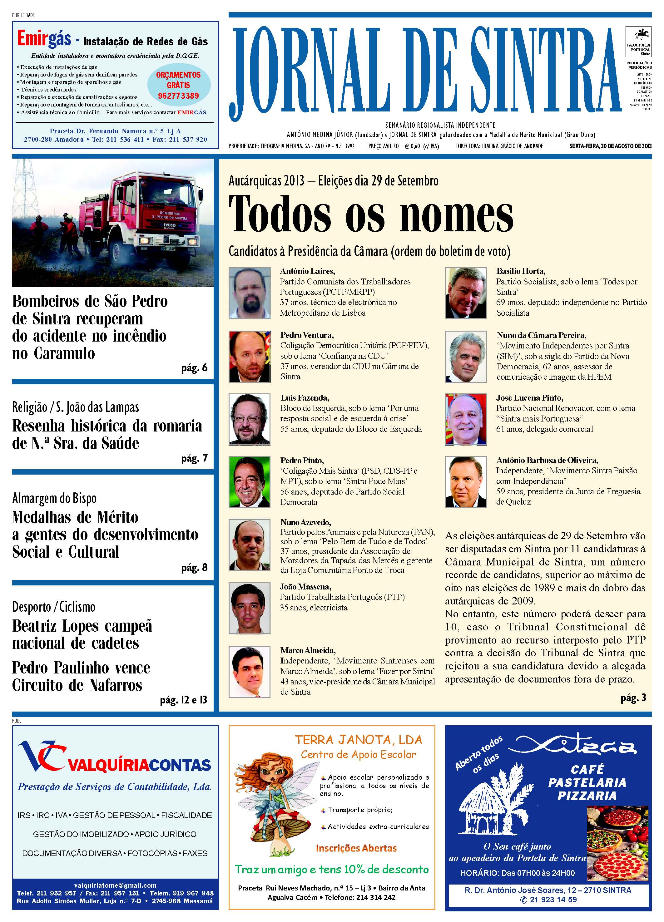 “Todos os nomes – Candidatos à Presidência da Câmara” é a manchete do Jornal de Sintra, edição n.º 3992 de 30 de Agosto de 2013, pág. 3.