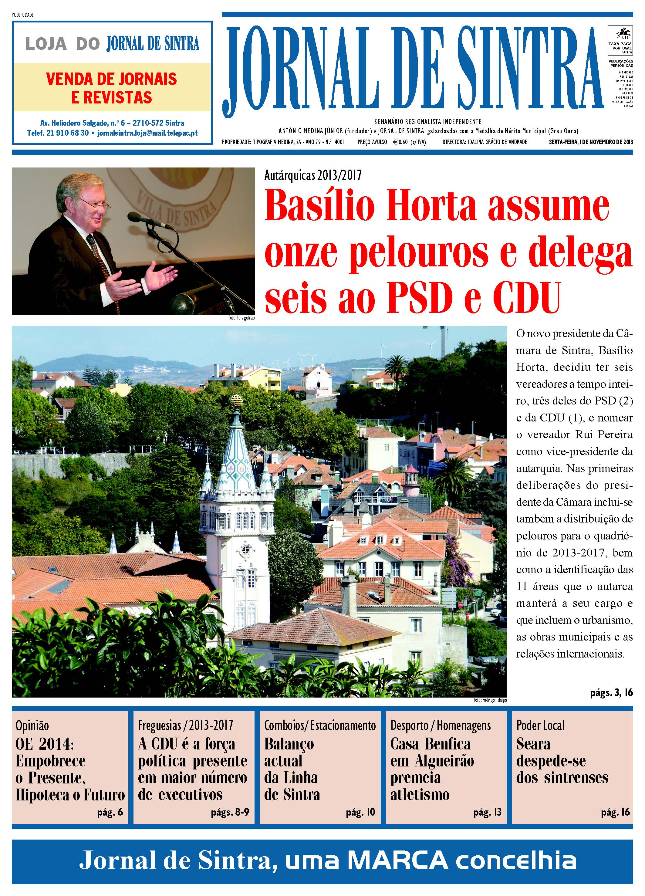Autárquicas 2013/2017 – “Basílio Horta assume onze pelouros e delega seis ao PSD e CDU” é a manchete do Jornal de Sintra, edição n.º 4001 de 1 de novembro de 2013. Destaques para Opinião/OE 2014: Empobrece o Presente, Hipoteca o Futuro, pág 6; A CDU é a força política presente em maior número de executivos, pág 8-9; Comboios /Estacionamento – Balanço actual da Linha de Sintra, pág. 10; Desporto / Homenagens – Casa Benfica em Algueirão premeia atletismo, pág. 13; Poder Local – Seara despede-se dos Sintrenses, pág. 16.