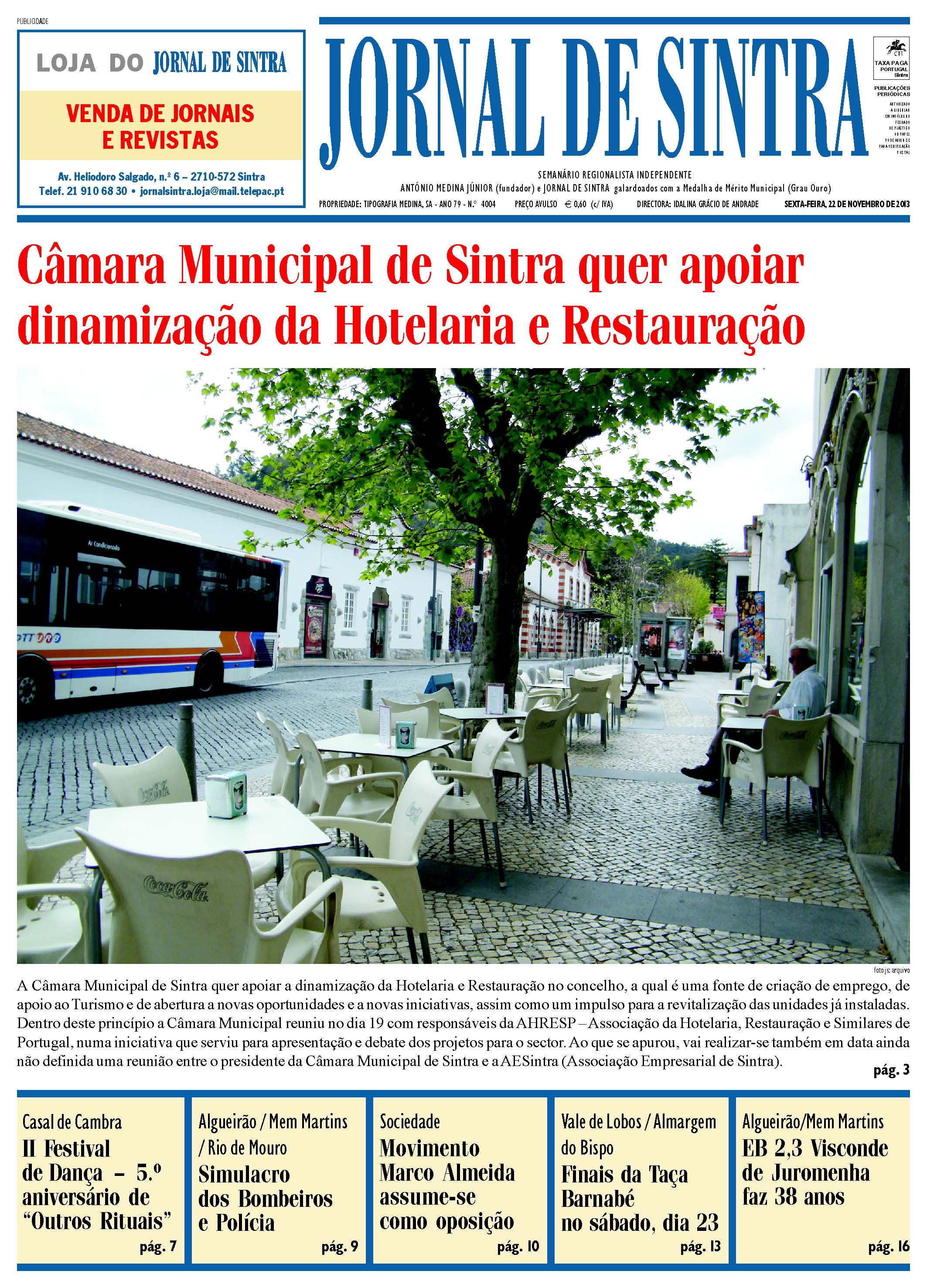 Capa 22-11-2013Câmara Municipal de Sintra quer apoiar dinamização da Hotelaria e Restauração é a manchete do Jornal de Sintra, edição n.º 4004 de 22 de novembro de 2013. Destaques para: Casal de Cambra – II Festival de Dança – 5.º aniversário de “Outros Rituais”, pág. 7; Algueirão/Mem Martins / Rio de Mouro – Simulacro dos Bombeiros e Polícia, pág. 9; Movimento Marco Almeida assume-se como oposição, pág. 10; Vale de Lobos / Almargem do Bispo – Finais da Taça Barnabé no sábado, dia 23, pág. 13; Algueirão/Mem Martins – EB2,3 Visconde de Juromenha faz 38 anos, pág. 16.