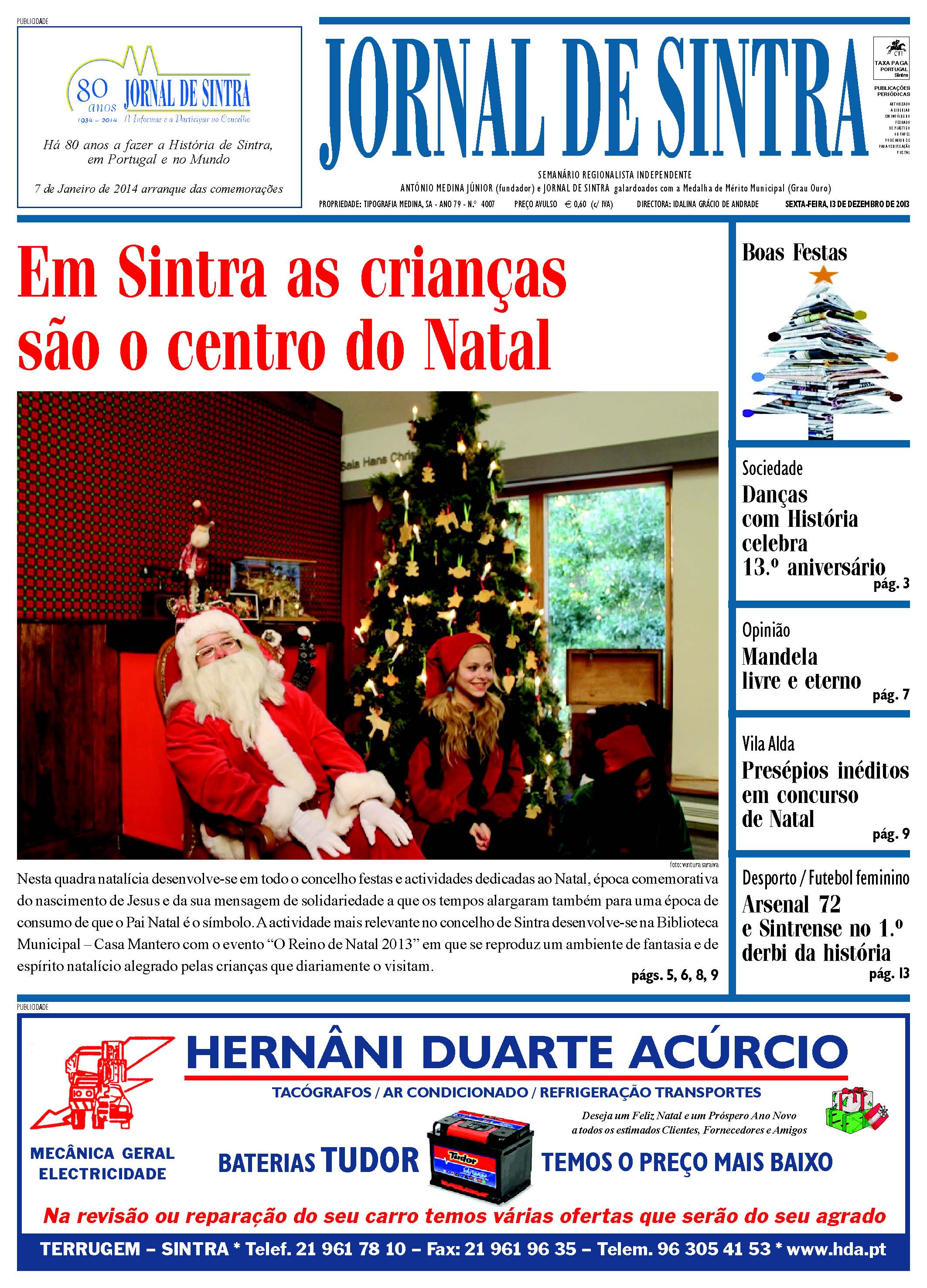Em Sintra as crianças são o centro do Natal é a manchete do Jornal de Sintra, edição n.º 4007 de 13 de dezembro de 2013. Destaques para: Sociedade – Danças com História celebra 13.º aniversário, pág. 3; Opinião / Mandela livre e eterno, pág. 7; Vila Alda / Presépios inéditos em concurso de Natal, pág. 9; Desporto / Futebol feminino – Arsenal 72 e Sintrense no 1.º derbi da história, pág. 13