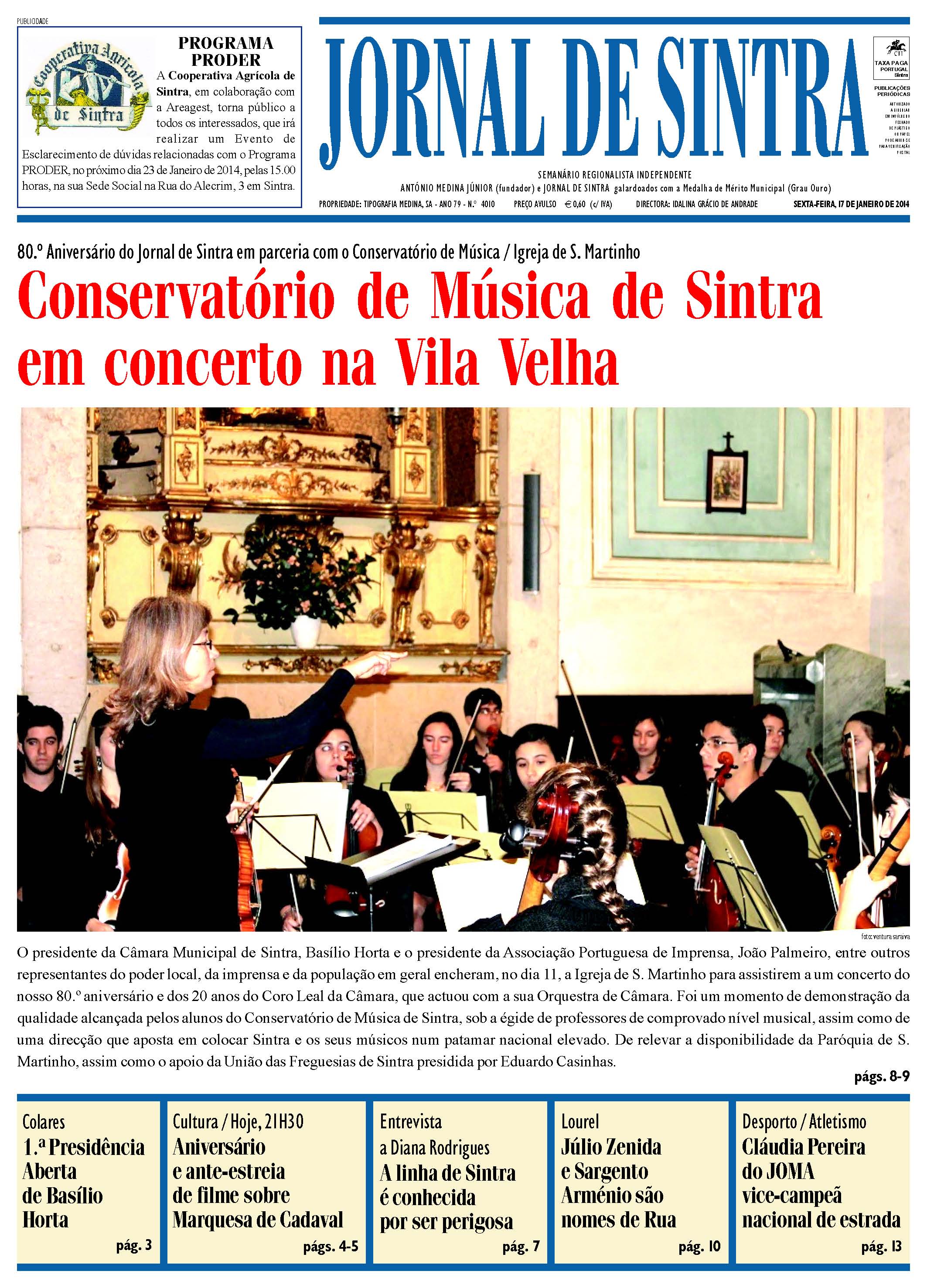 80.º Aniversário do Jornal de Sintra em parceria com o Conservatório de Música / Igreja de S. Martinho – Conservatório de Música de Sintra em concerto na Vila Velha é a manchete do Jornal de Sintra, edição n.º 4010 de 17 de janeiro de 2014. Destaques para: Colares – 1.ª Presidência aberta de Basílio Horta, pág. 3; Cultura / Hoje, 21h30, Aniversário e ante-estreia do filme sobre Marquesa do Cadaval, págs. 4-5; Entrevista a Diana Rodrigues – A linha de Sintra é conhecida por ser perigosa, pág. 7; Loures / Júlio Zenida e Sargento Arménio são nomes de Rua, pág. 10; Desporto / Atletismo – Cláudia Pereira do JOMA vice-campeã nacional de estrada, pág. 13.
