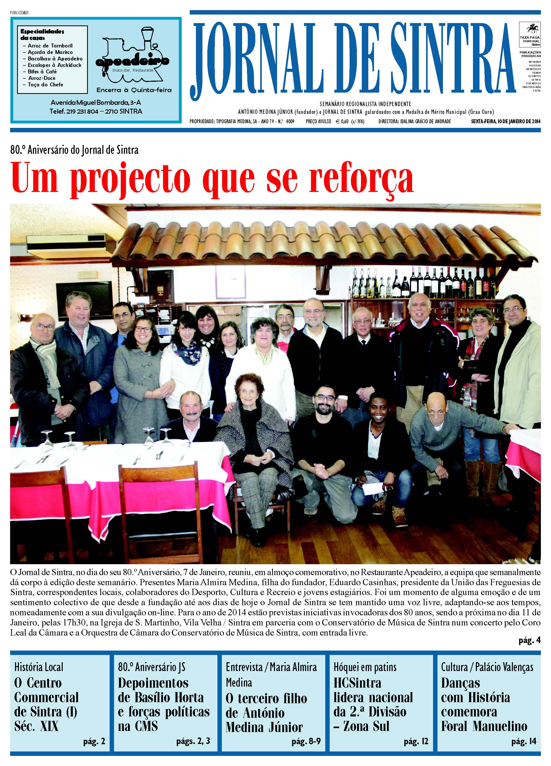 80.º Aniversário do Jornal de Sintra – Um projecto que se reforça é a manchete do Jornal de Sintra, edição n.º 4009 de 10 de janeiro de 2014. Destaques para: História Loca – O “Centro Commercial” (I)m pág. 2; Depoimentos de Basílio Horta e forças políticas na CMS, pág. 2, 3; Entrevista / Maria Almira Medina – O terceiro filho de António Medina Júnior, pág. 8-9; Hóquei em Patins – HCS lidera nacional da 2.ª Divisão – Zona Sul, pág. 12; Cultura / Palácio Valenças – Danças com História comemora Foral Manuelino, pág. 14.