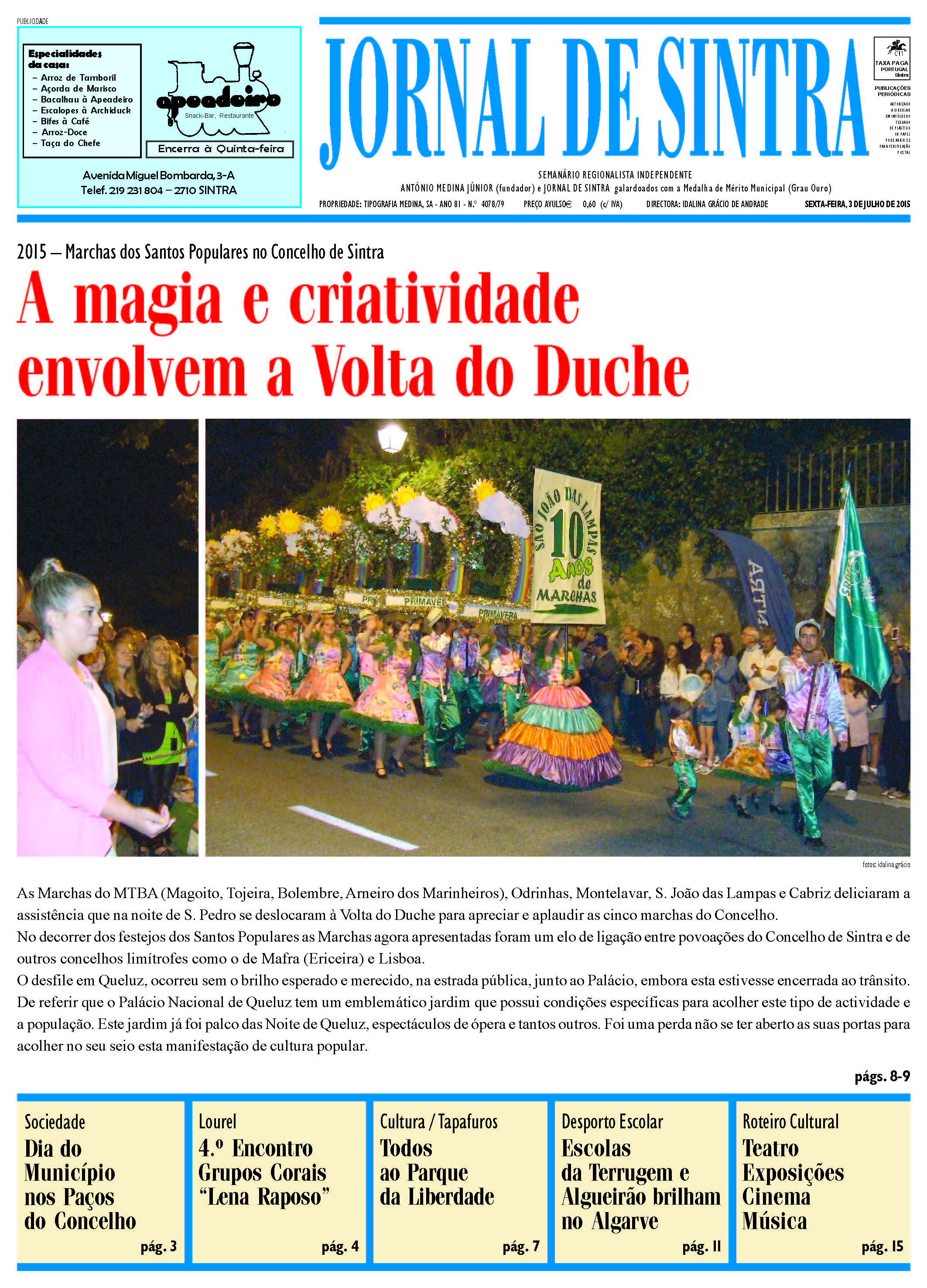 “A magia e criatividade envolvem a Volta do Duche” é a manchete da edição n.º 4078/79 do Jornal de Sintra, num destaque às marchas dos santos populares no concelho. Destaque, também, para: Dia do Município nos Paços do Concelho, pág. 3 / 4.º Encontro Grupos Corais “Lena Raposo”, pág. 4 / Todos ao Parque da Liberdade, pág. 7 / Escolas da Terrugem e Algueirão brilham no Algarve, pág. 11 / Roteiro Cultural – Teatro, Exposições, Cinema, Música, pág. 15.