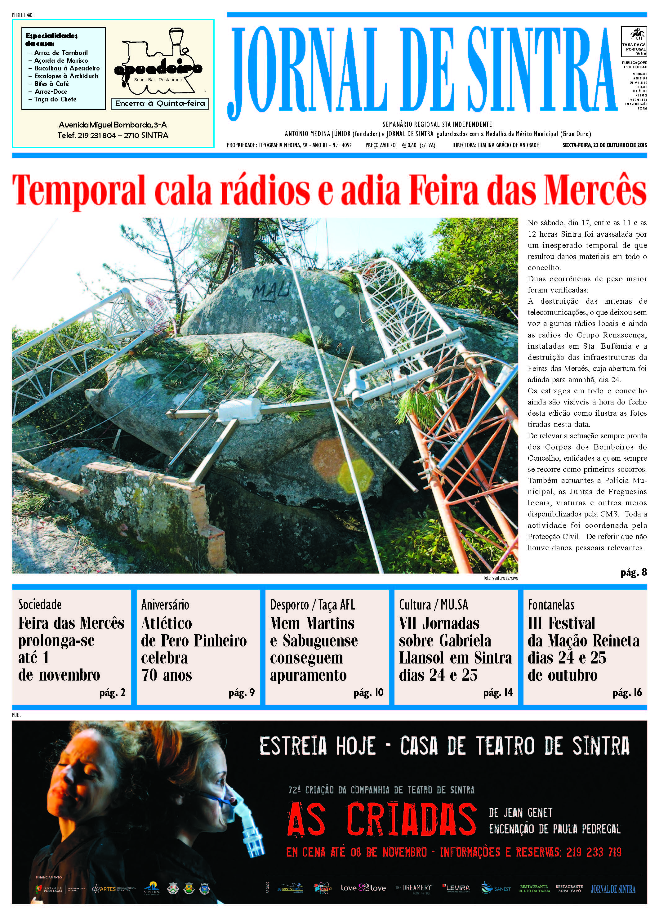 “Temporal cala rádios e adia Feira das Mercês” é a manchete da edição n.º 4092, de 23 de Outubro de 2015, do Jornal de Sintra.