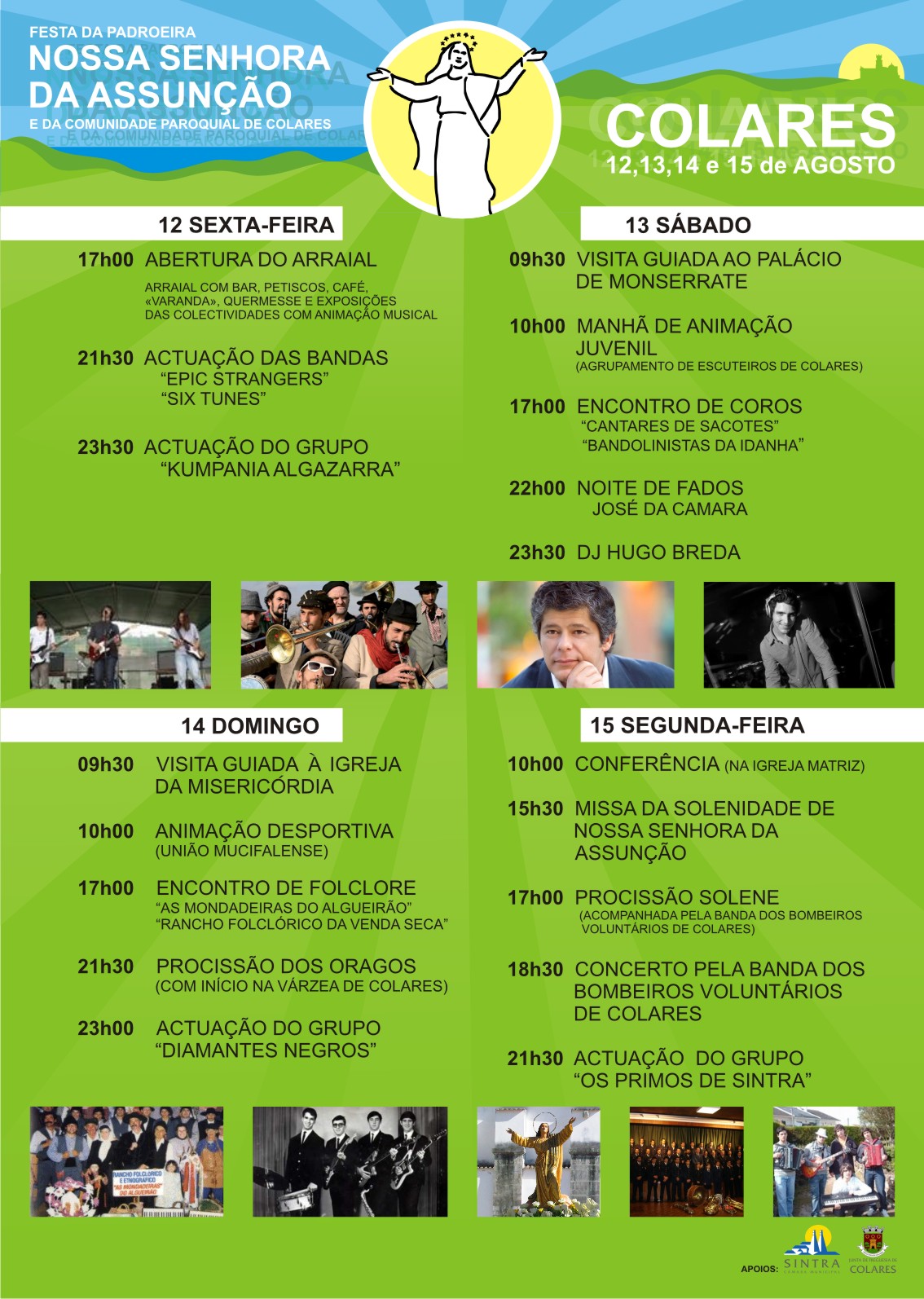 Vai realizar-se nos próximos dias 12, 13, 14 e 15 de Agosto a Festa de Padroeira Nossa Senhora da Assunção e da Comunidade Paroquial de Colares no largo adjacente à Igreja Matriz, Largo Dr. Carlos França em Colares.