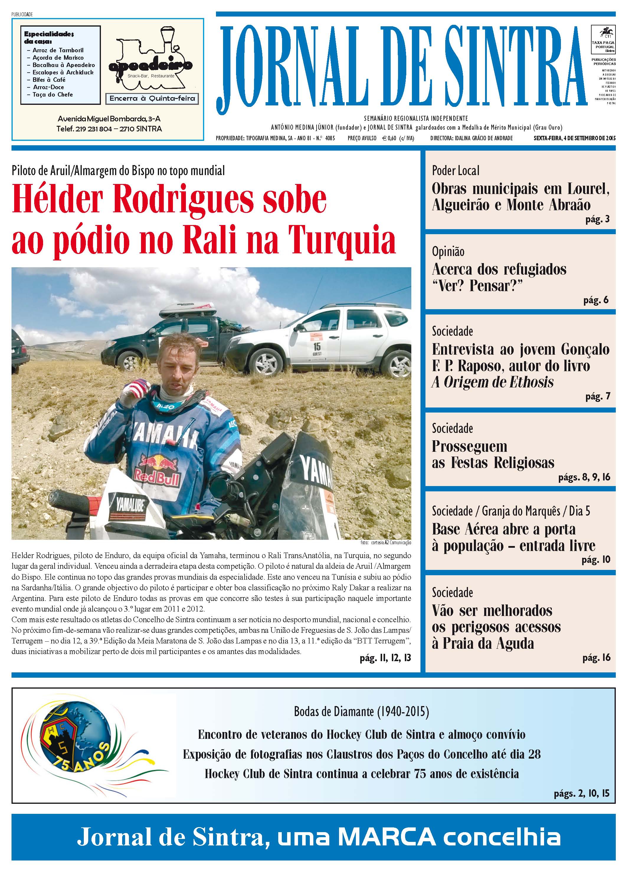 “Hélder Rodrigues sobe ao pódio no Rali na Turquia” é a manchete da edição n.º 4085, de 4 de Setembro, do Jornal de Sintra. Veja aqui a edição em PDF com os restantes destaques.