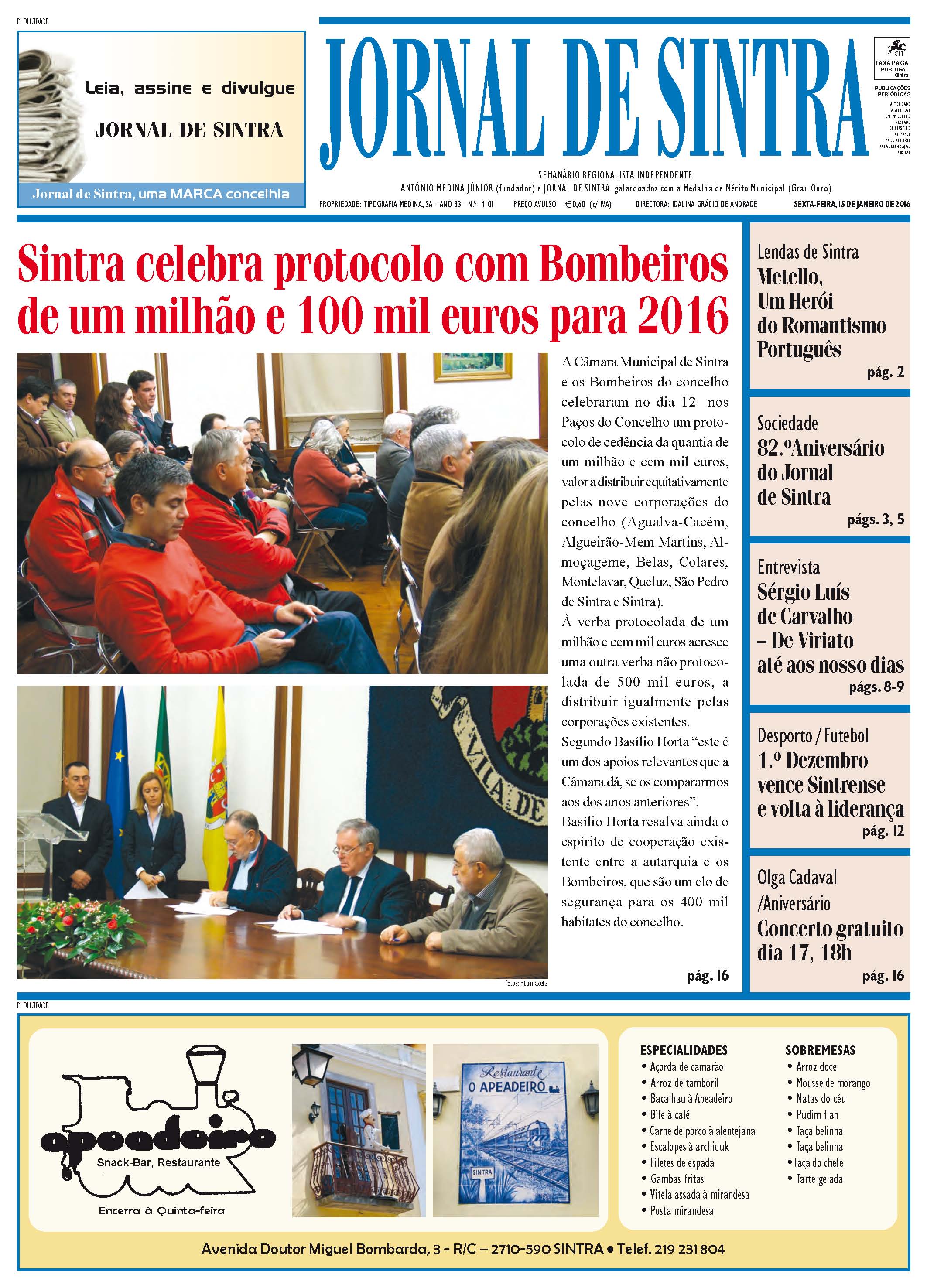 “Sintra celebra protocolo com Bombeiros de um milhão e 100 mil euros para 2016″ é a manchete da edição n.º 4101 do Jornal de Sintra, de 15 de Janeiro de 2016.
