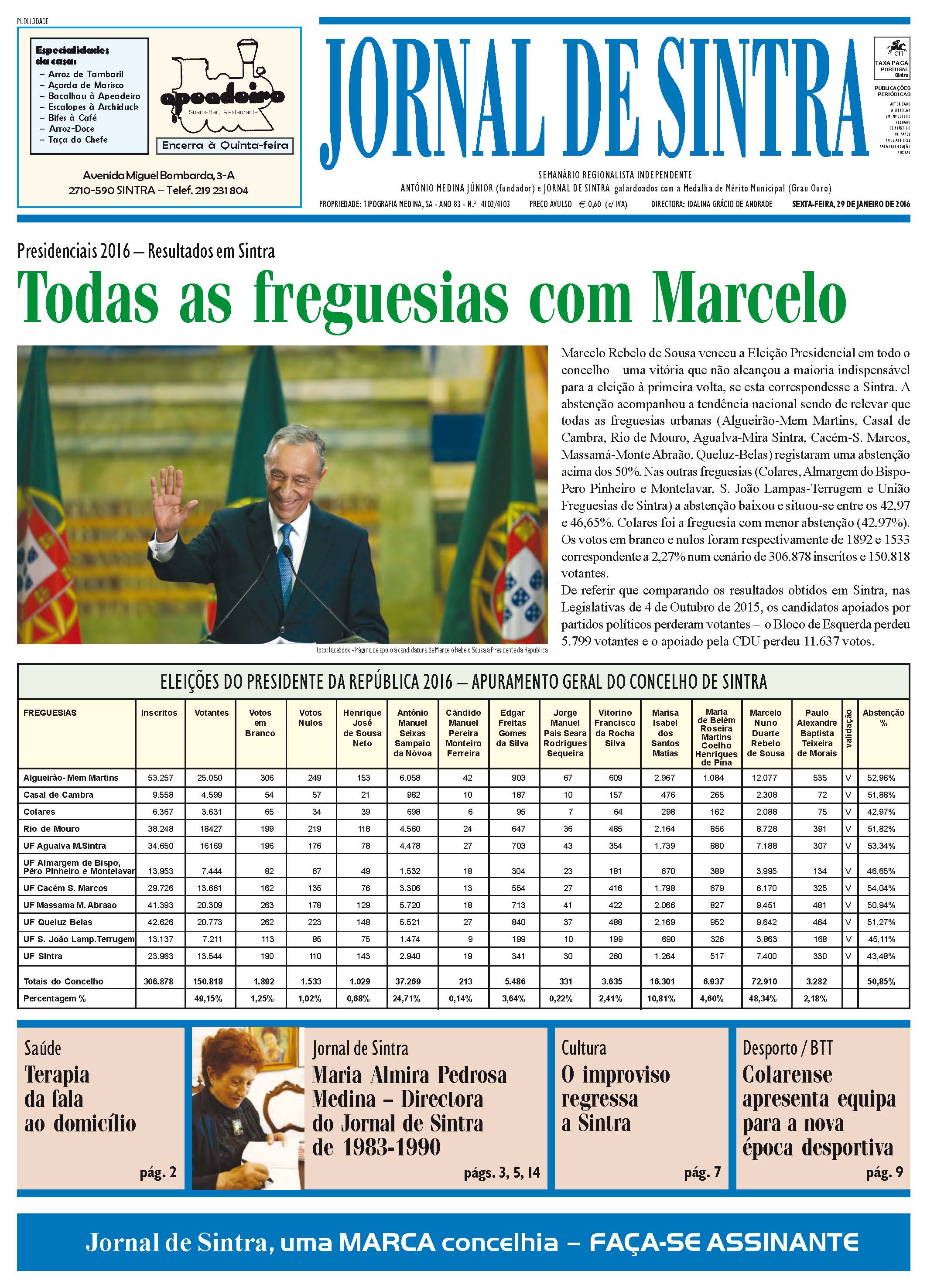 “Todas as freguesias com Marcelo” é a manchete da edição n.º 4102/4103 do Jornal de Sintra, que destaca os resultados em Sintra das Eleições Presidenciais 2016.